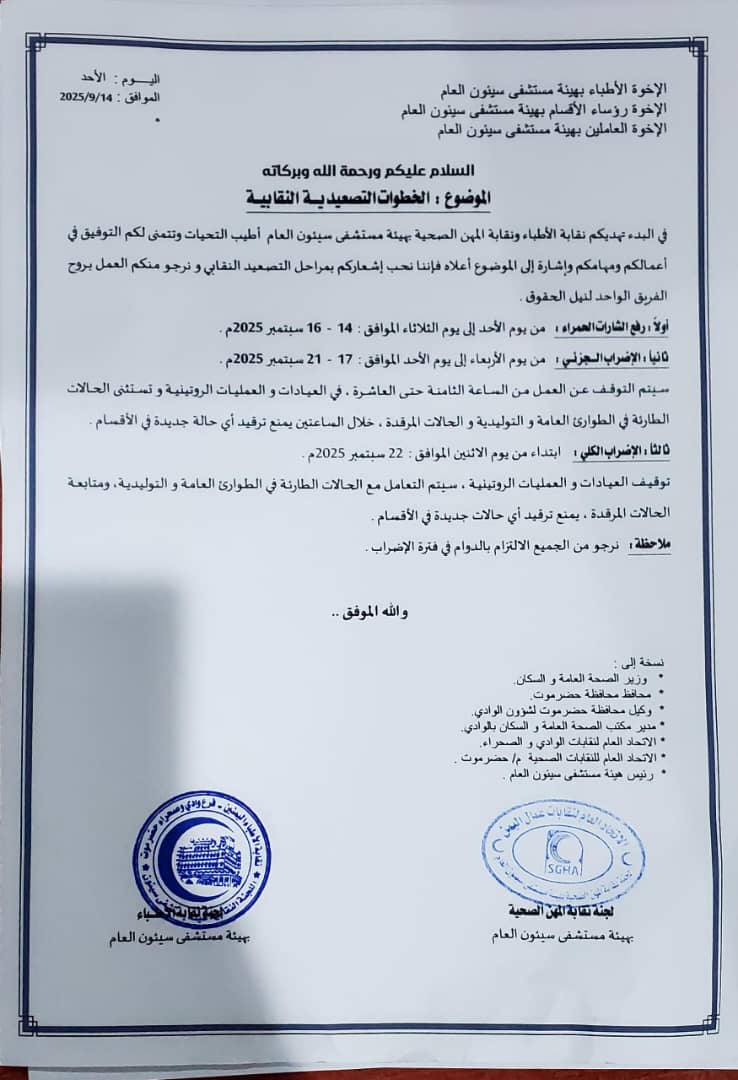أعلنت نقابتا الأطباء والمهن الصحية في هيئة مستشفى سيئون بدء خطوات تصعيدية احتجاجًا على عدم تلبية مطالبهم