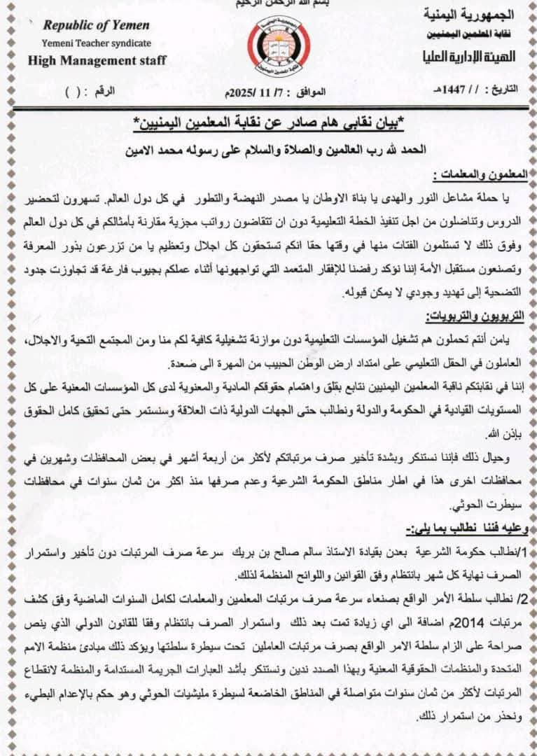 عبّرت نقابة المعلمين اليمنيين عن رفضها لاستمرار تأخير صرف رواتب المعلمين في مناطق الحكومة الشرعية،