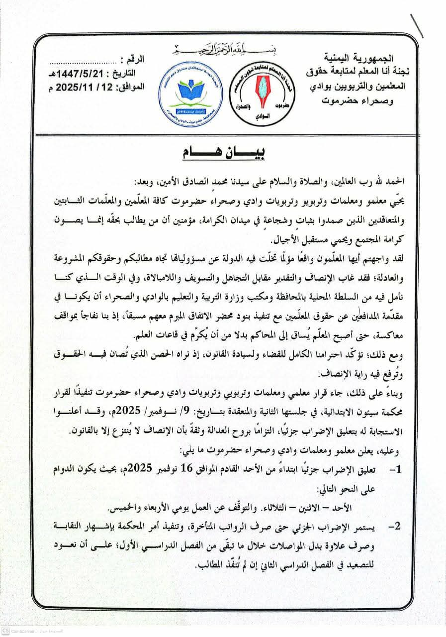 أعلن معلمو ومعلمات وتربويو مديريات وادي وصحراء حضرموت، تعليق الإضراب جزئيًا ابتداءً من يوم الأحد الموافق 16
